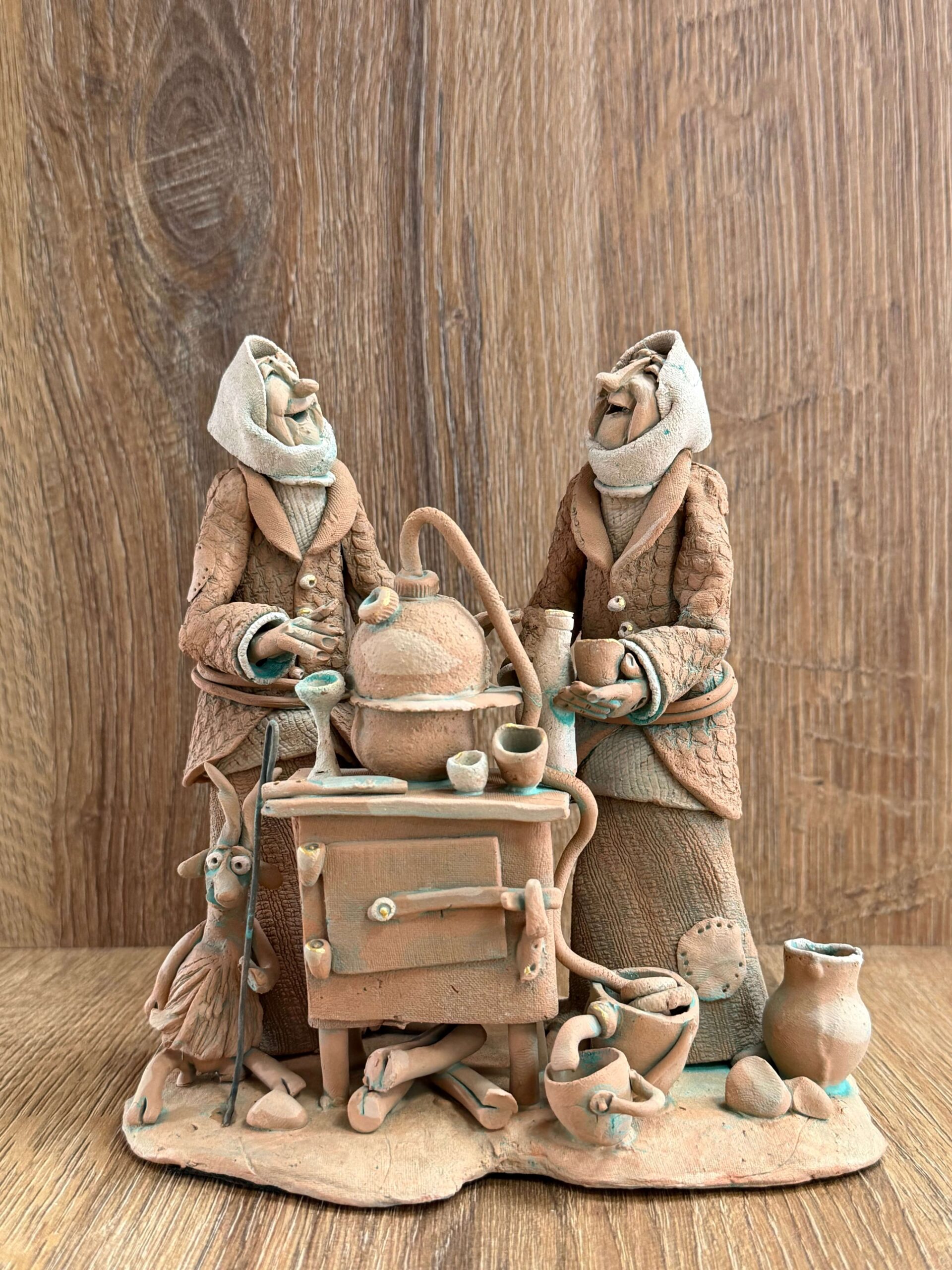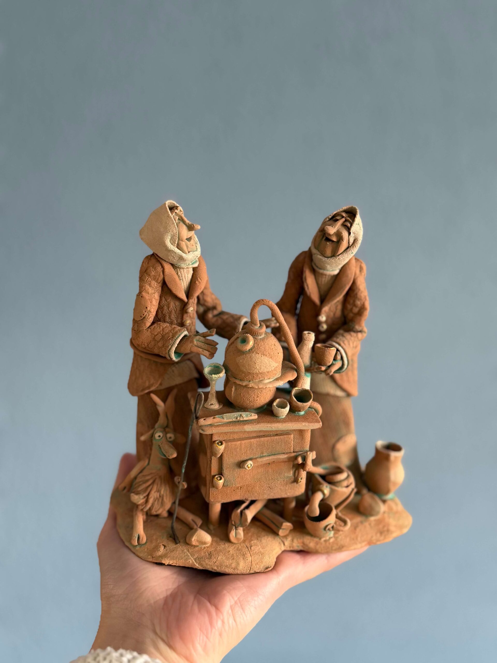 Все изделия выполнены из натуральной глины с характерной текстурой и ручной проработкой мелких элементов. Каждая фигурка имеет индивидуальный характер и настроение.