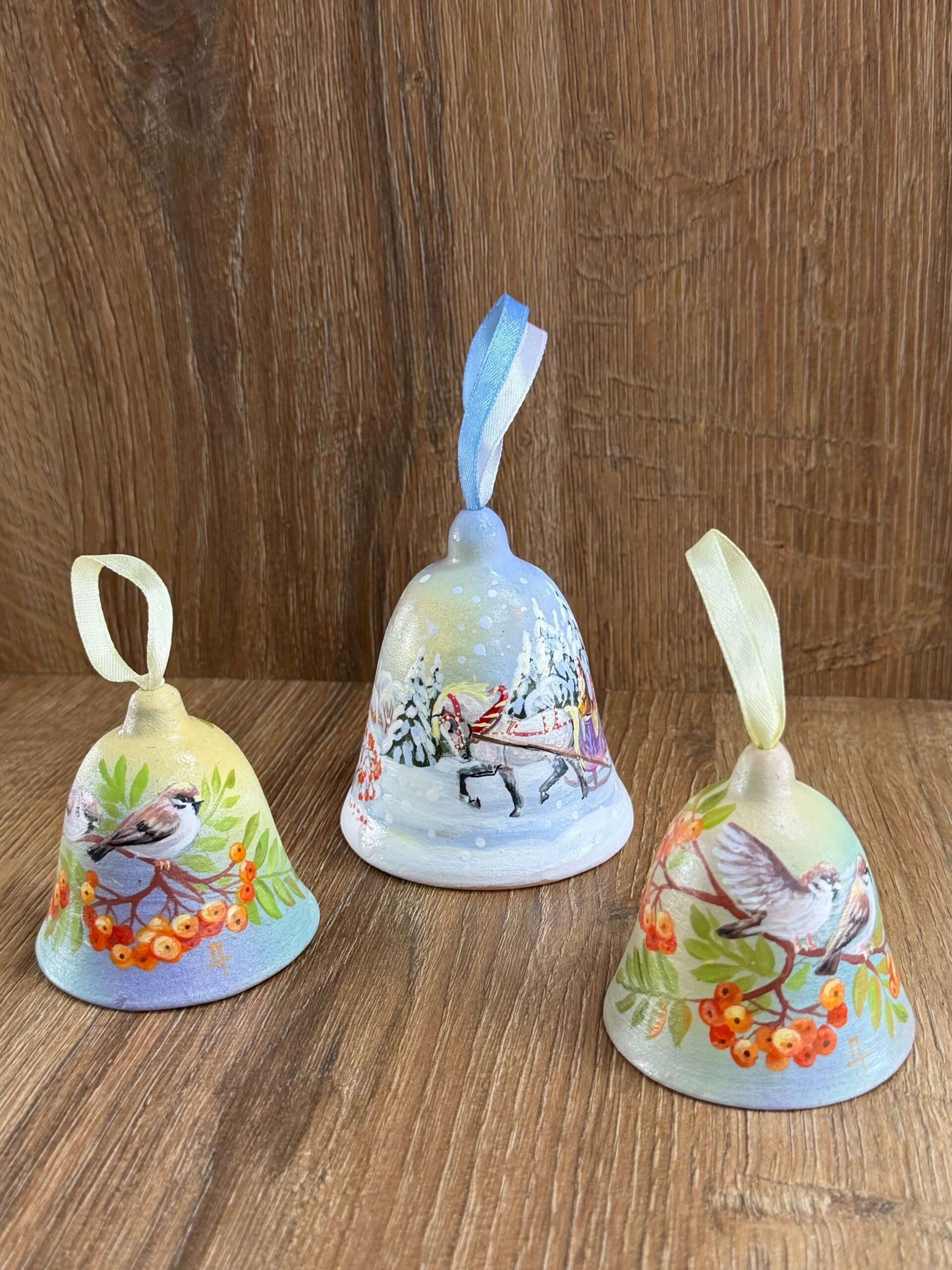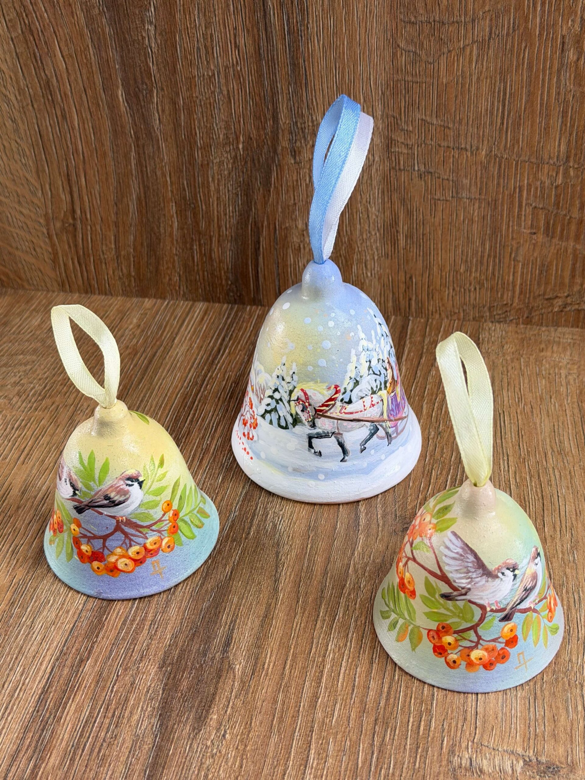 Нежные расписные колокольчики с зимними сюжетами, изображениями птиц и природными мотивами выполнены вручную. Каждый экземпляр уникален: аккуратная роспись, мягкие пастельные оттенки, декоративная ленточка для подвешивания. Такой сувенир можно использовать как украшение интерьера или новогодний декор.